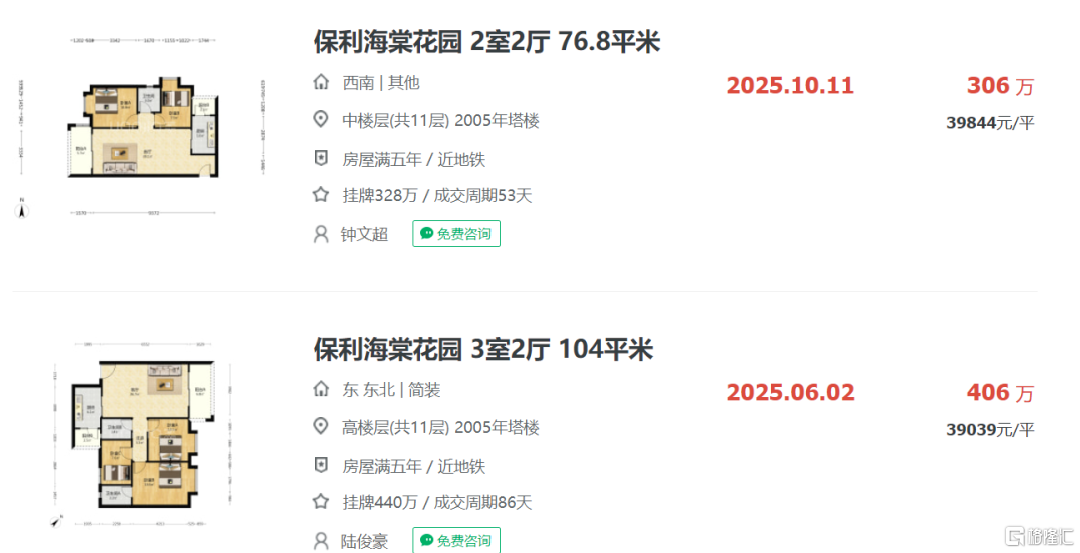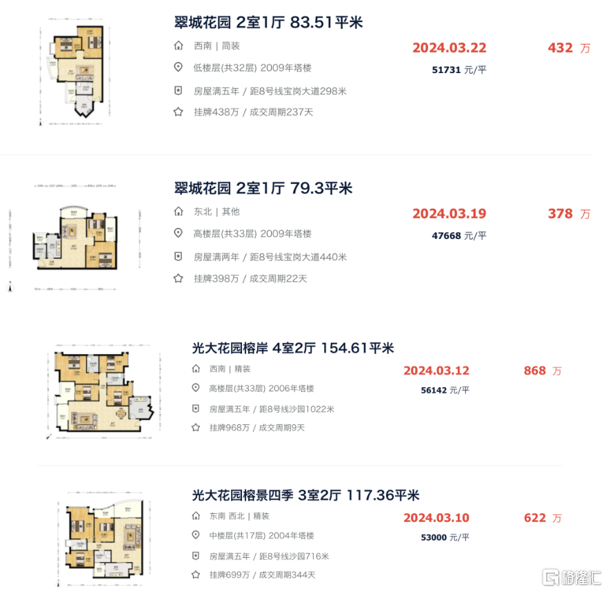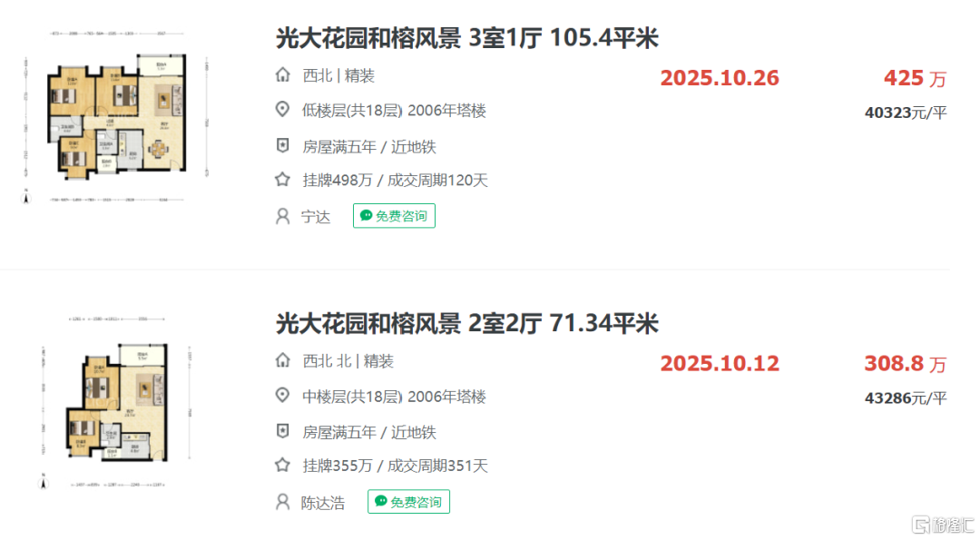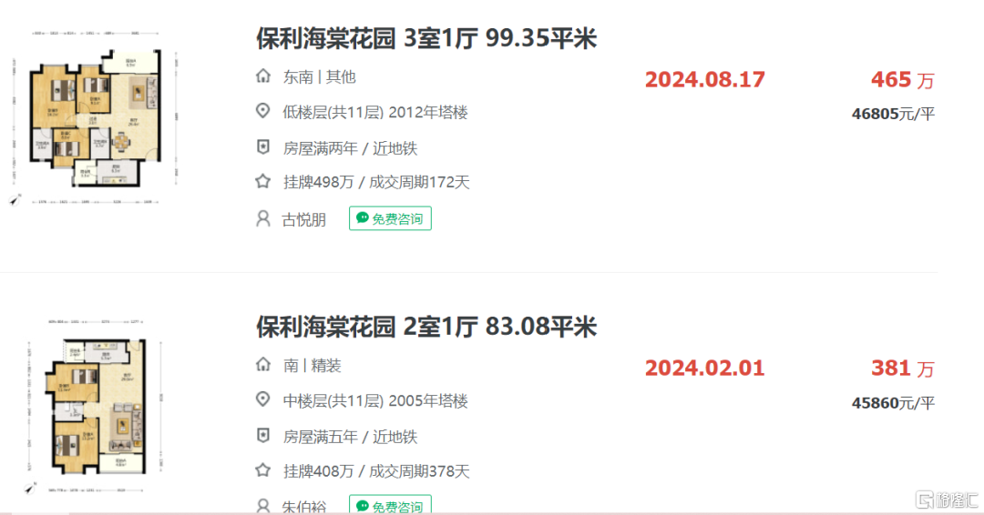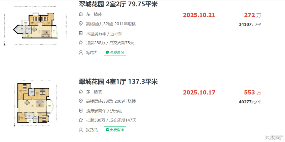 比如保利海棠花园的成交已经从去年3月4.5万—4.6万/平,今年10月已经不到4万/平,光大花园的成交,从去年3月的5.3万—5.6万/平回到10月的4.0万—4.3万/平,翠城花园从去年3月的4.7万—5.1万/平,回到3.4万—4.1万/平。