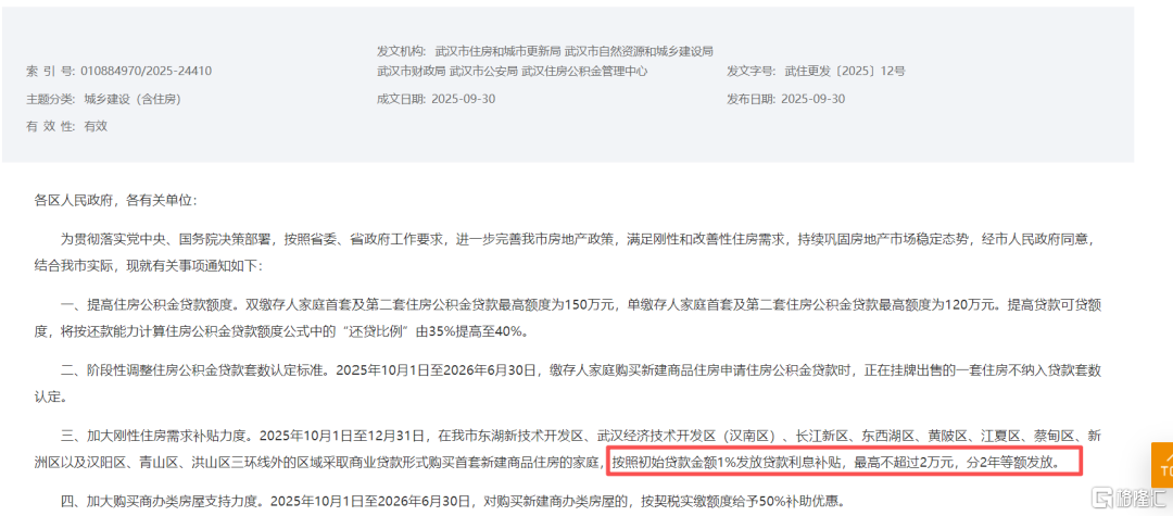 2025年10月1日至12月31日,在我市东湖新技术开发区、武汉经济技术开发区(汉南区)、长江新区、东西湖区、黄陂区、江夏区、蔡甸区、新洲区以及汉阳区、青山区、洪山区三环线外的区域采取商业贷款形式购买首套新建商品住房的家庭,按照初始贷款金额1%发放贷款利息补贴,最高不超过2万元,分2年等额发放。”