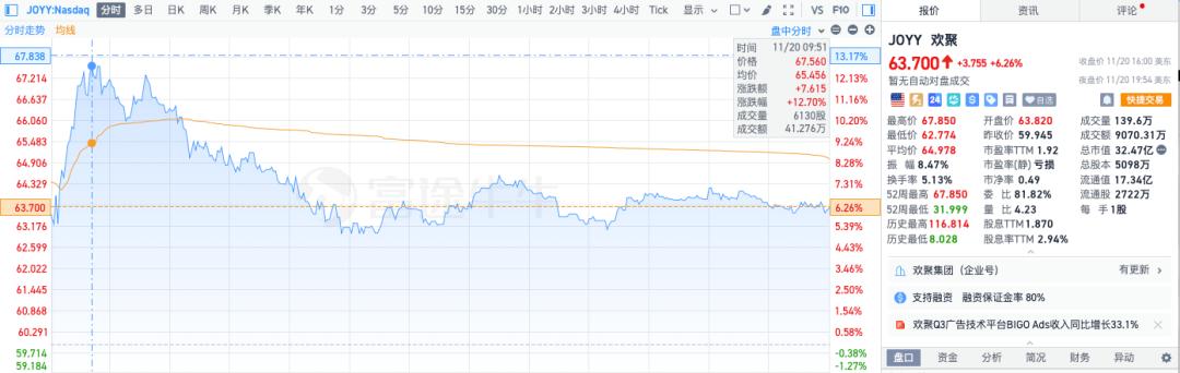 市场反应也非常直接,三季报发布后,昨日美股盘中欢聚一度涨超12%,最高触及67.85美元。
