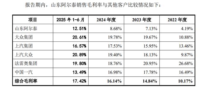 安达股份在采购环节也存在诸多问题,尤其是采购价格的公允性备受质疑。公司通过山东阿尔泰向现代坦迪斯供应变速箱壳体及后盖总成产品,该业务一度成为营收增长引擎。然而,2022年到2025年上半年,安达股份对山东阿尔泰的销售毛利率分别为4.19%,7.13%、8.68%和12.51%,显著低于其他客户。公司未分析单独向现代坦迪斯供应产品的价格公允性,引发北交所对是否存在异常资金往来、利益输送或特殊利益安排的质疑。