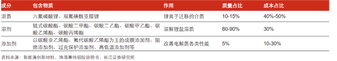 电解液主要由锂盐、有机溶剂及添加剂构成,按质量占比划分,有机溶剂占比80%-90%,锂盐占比10%-15%,添加剂占比约5%;成本构成层面,锂盐溶质占电解液总成本比重较高。