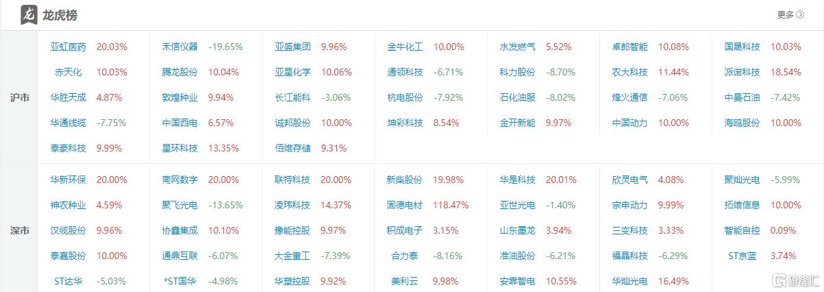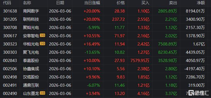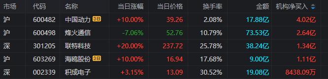 龙虎榜中涉及机构专用席位的个股中,当日净买入额前三为烽火通信、联特科技、积成电子,分别为2.64亿元、1.34亿元、8438.09万元。