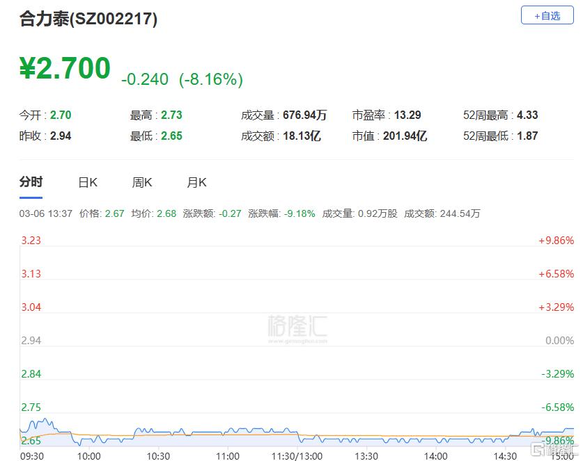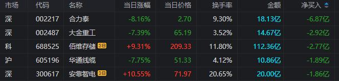 龙虎榜单日净卖出额前三为合力泰、大金重工、华通线缆,分别为6.87亿元、2.92亿元、1.89亿元。