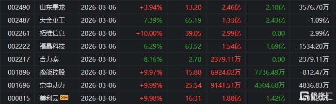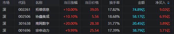 龙虎榜单日净买入额前三为拓维信息、协鑫集成、南网数字,分别为9.02亿元、6.95亿元、3.89亿元。