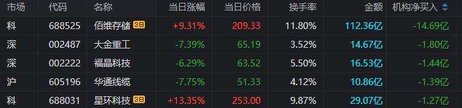 华通线缆:下跌7.75%,换手率4.12%,成交量20.8万手,成交额10.86亿元。龙虎榜数据显示,机构合计净卖出1.39亿元,北向资金合计净卖出6223.14万元。