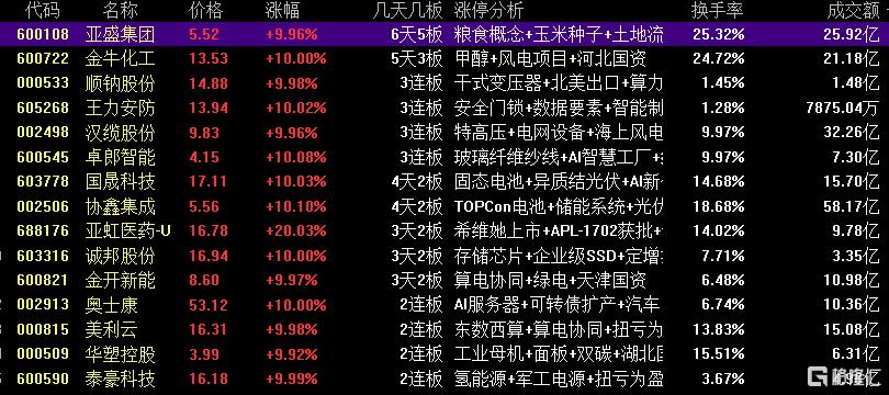 焦点股方面,算电协同概念股豫能控股12天8板,电网设备板块汉缆股份11天7板,农业股亚盛集团反包涨停走出6天5板。