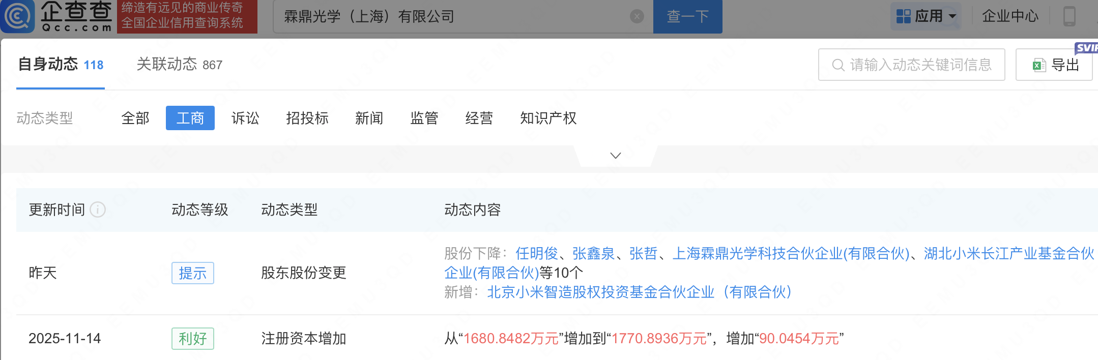 企查查APP显示,近日,霖鼎光学(上海)有限公司发生工商变更,新增北京小米智造股权投资基金合伙企业(有限合伙)为股东,持股5.08%,同时注册资本增至1770.89万元。企查查信息显示,该公司成立于2019年,法定代表人为任明俊,经营范围包含:电子测量仪器制造;光学仪器制造;光学仪器销售;光学玻璃制造等,湖北小米长江产业基金合伙企业(有限合伙)对其持有9.11%股份。据其官网,霖鼎光学专注于超精密技术研发和光学智能制造。