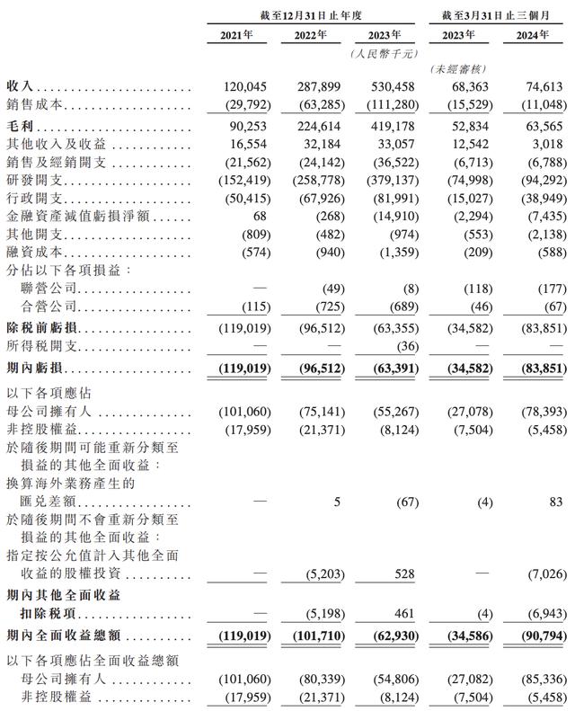 2021年、2022年、2023年度以及2024年第一季度,迅策科技的收入分别约1.20亿元、2.88亿元、5.30亿元和7461.3万元,毛利分别约9025.3万元、2.25亿元、4.19亿元和6.36亿元,净亏损分别约1.19亿元、9651.2万元、6339.1万元和8385.1万元。