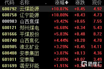 煤炭股逆势上涨,云煤能源、辽宁能源涨停,山西焦煤涨超9%,郑州煤电涨超6%,平煤股份、山西焦化等跟涨。