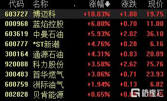 油气股表现活跃,博迈科涨停,蓝焰控股涨超6%,中曼石油涨超5%,通源石油、科力股份、首华燃气等跟涨。