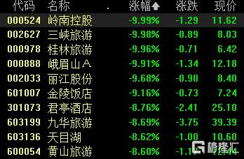 旅游及酒店股大跌,岭南控股、三峡旅游、桂林旅游跌停,丽江股份、金陵饭店跌超9%,君亭酒店、九华旅游等跟跌。