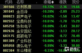 元件股走低,达利凯普、金百泽跌超10%,超声电子、宝鼎科技、协和电子、金安国纪、超颖电子、广合科技等多股10cm跌停。