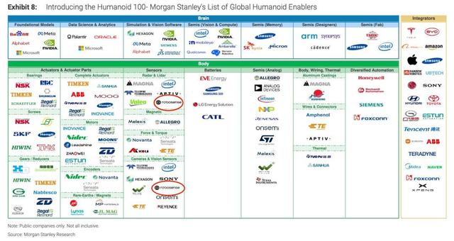 不久前,速腾聚创同样被收录于摩根士丹利发布的《The Humanoid 100: Mapping the Humanoid Robot Value Chain》(人形机器人100:绘制人形机器人价值链图谱),与英伟达、微软、谷歌、特斯拉等公司共同构成全球人形机器人产业链百强上市公司名单,彼时也是速腾聚创发布灵巧手后首次在行业研告中出现。