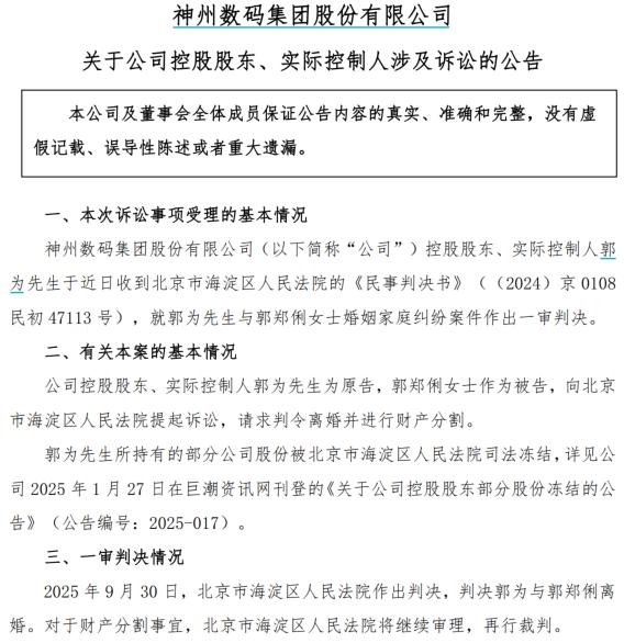 2025年10月10日深夜,神州数码发布了一则公告,将实控人郭为的离婚案呈现在公众面前。根据公告,北京市海淀区人民法院已于2025年9月30日一审判决郭为与郭郑俐离婚,但并未明确财产分割方案,只表示将“继续审理,再行裁判”。