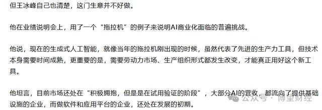 尽管这些投入已初见成效,但王冰峰在业绩说明会上坦言,AI商业化仍面临挑战。据《经济观察报微博》报道,王冰峰表示,大部分AI营收目前流向提供基础设施的企业,而做软件和应用平台的企业还处在发展初期。他用“拖拉机”比喻AI技术的发展阶段:虽然代表了先进的生产力工具,但技术本身需要时间成熟,更需要劳动力市场、生产组织形式都发生改变,才能真正用好这个新工具。