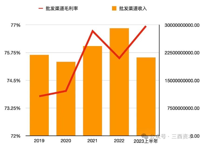 清理边缘产品线、对主导产品焕新升级的“取舍之道”拉高了批发渠道毛利率水平,2021年洋河股份批发渠道毛利率同比增加近三个百分点至76.72%,到2023年上半年已经逼近77%。省外市场毛利率从2021年同比增加两个百分点后,近三年一直维持在78%的水平。