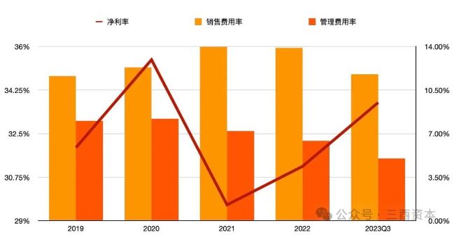 从“海天梦”的塔基产品海之蓝,到高端化的主打产品梦6+,再到在海内外不断强化品牌标签,洋河在推进产品结构与渠道高端化的过程中实现销售费用率连续两年下降,管理费用率更是连续三年下降。近三年来,降本增效作用之下,净利率在2021年触底跌破30%后,随后连续企稳回升至2023年第三季度末的33.75%,近两年累计增长超四个百分点。