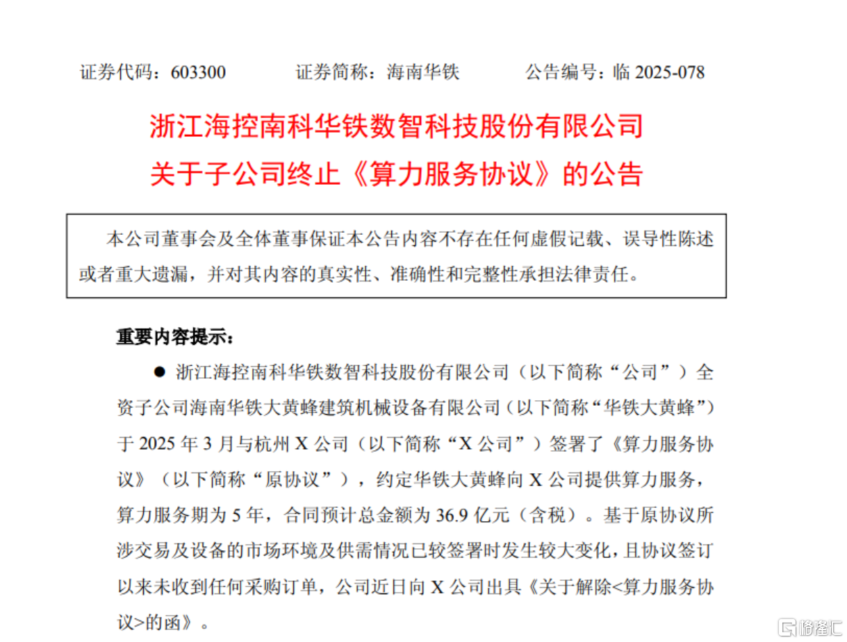 就在不到一个月前(9月30日),海南华铁披露公告称,其全资子公司华铁大黄蜂与X公司签订的《算力服务协议》宣告终止。该协议签署于今年3月,原定服务期5年,合同总金额高达36.9亿元。