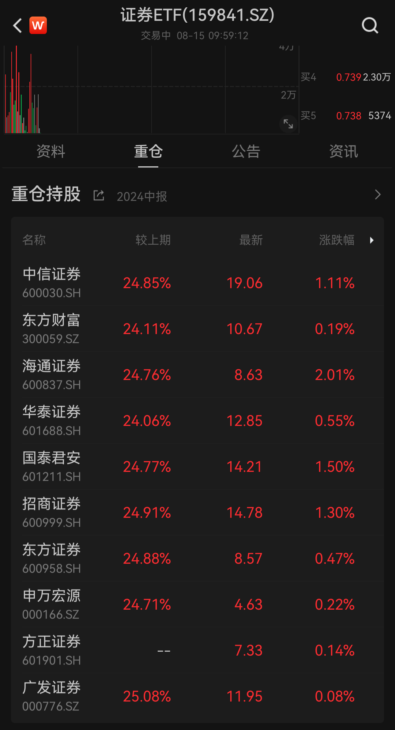 盘面上,大金融概念震荡拉升,证券、多元金融方向领涨。截至9:59,证券ETF(159841)早盘急升涨0.95%,成交额达3013万元。十大权重股集体上涨,海通证券涨超2%,国泰君安、招商证券、中信证券、华泰证券等个股跟涨。