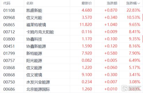 港股市场同步共振,光伏太阳能概念股表现活跃。其中,截至发稿,信义光能涨超10%,福莱特玻璃、协鑫新能源、新特能源、协鑫科技、阳光能源、信义能源等个股也纷纷跟涨。