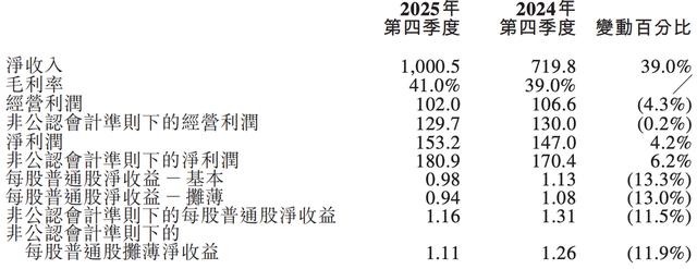 2025年第四季度,禾赛的净利润约为1.53亿元,较2024年同期的1.47亿元增长4.2%;非公认会计准则下的净利润约为1.81亿元,较2024年同期的1.70亿元增长6.2%。