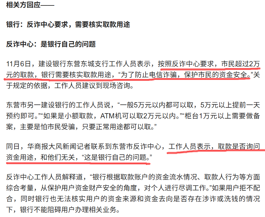 11月6日,建行东营东城支行工作人员向华商报大风新闻表示,根据反诈中心要求,对超过2万元的取现需核实用途,理由是“为了防止电信诈骗,保护市民的资金安全”。