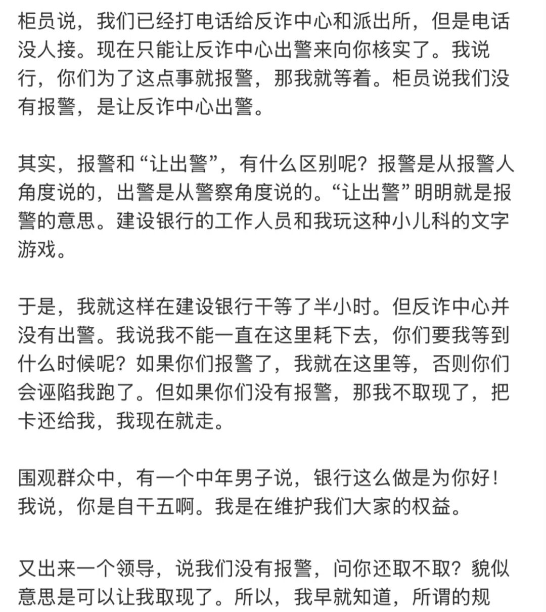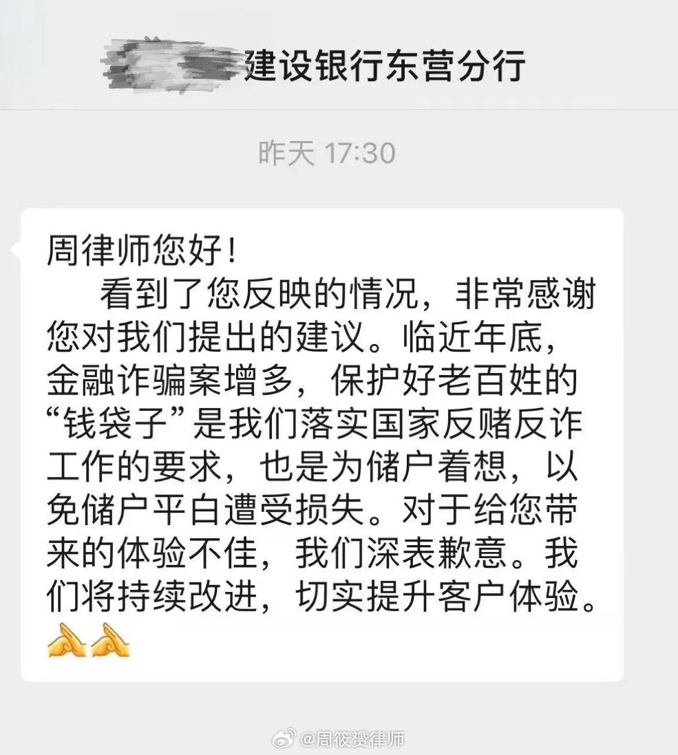 11月初,知名律师周筱赟准备在建设银行山东东营东城支行取4万元现金,却遭柜员盘问用途、被要求与反诈中心核实、甚至据称被“出警”,引发舆论热议。