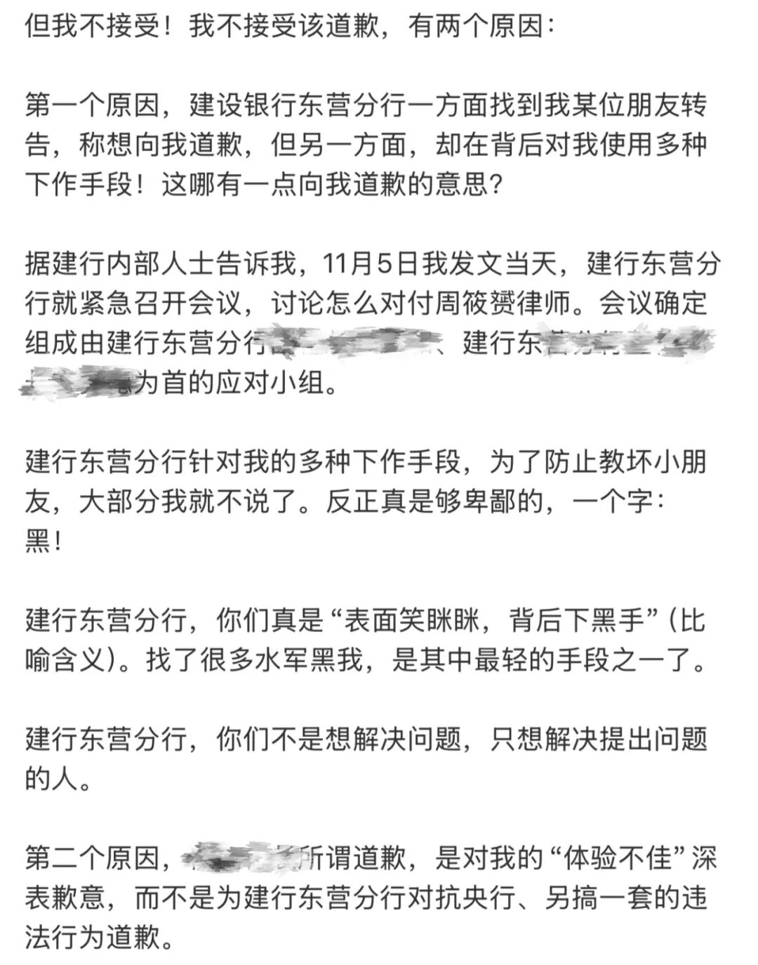 11月7日,他进一步公开建行东营分行副行长的道歉短信,并拒绝接受。