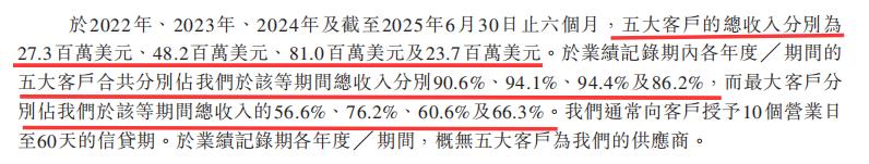 同期,最大单一客户贡献的收入占比分别为56.6%、76.2%、60.6%及66.3%,显示出公司对个别大客户存在较高依赖。