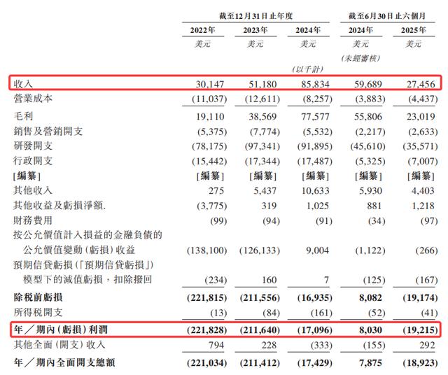 然而,截至目前,英矽智能尚未有产品实现商业化,公司整体仍处于未盈利状态。招股书显示,2022年-2024年,公司的营业收入分别为3014.7万美元、5118万美元和8583.4万美元;同期净亏损分别为2.22亿美元、2.12亿美元和1709.6万美元。不难看出,在2024年公司的亏损幅度出现明显收窄。