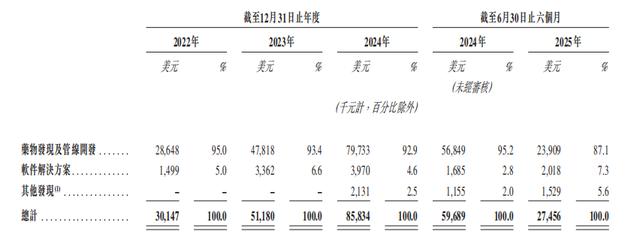 从收入结构看,英矽智能具有典型的AI制药企业特征。招股书显示,2022 - 2024年,公司营收从3014.7万美元增至8583.4万美元,看似增长迅猛,但超90%收入来自药物发现及管线开发业务,且高度依赖里程碑付款模式。而软件解决方案等其他收入占比微弱。