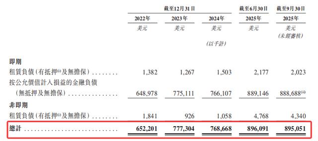 此外,英矽智能的负债规模仍在持续扩大。公司负债净额从2022年末的4.5亿美元攀升至2025年6月末的6.81亿美元,财务杠杆压力增大。截至2025年9月末,公司债务达8.95亿美元,较2022年末增长37.24%。其中,按公允价值计入损益的金融负债占比超过99%。