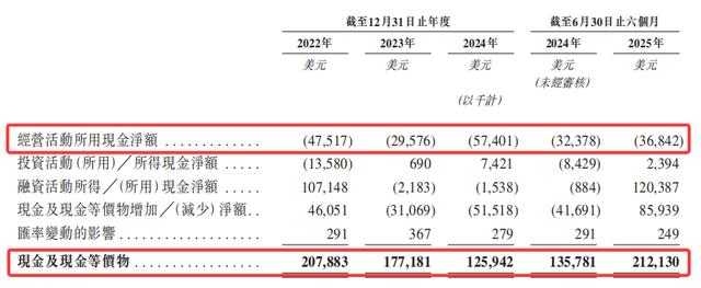 持续亏损让英矽智能不断产生负向的现金流量。招股书显示,2022年至2025年上半年,公司的经营现金流出分别约为4751.7万美元、2957.6万美元、5740.1万美元、3684.2万美元。
