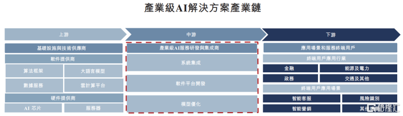 海致科技这类产业级AI解决方案提供商位于产业链中游核心地位,通过全面的系统集成、软件开发、模型训练优化等能力,为下游产业客户提供多元化AI解决方案。