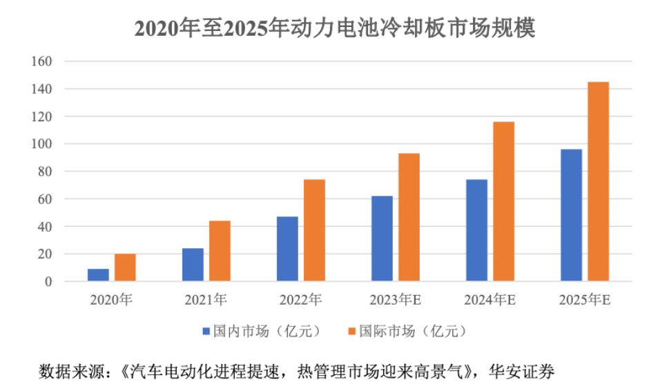 据招股书披露,新能源汽车动力电池热管理系统中电池液冷板单车价值约为700元,根据新能源汽车的产销量推测2022年我国新能源汽车动力电池液冷板的市场规模约为47亿元。在不考虑电池集成技术革新所引致的电池液冷板产品附加值提升等因素的情况下,预测2025年全球动力电池液冷板的市场规模将达到145亿元,其中国内市场规模将达到96亿元,较2022年分别增长95.95%和104.26%,具有广阔的成长空间。
