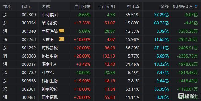 龙虎榜中涉及机构专用席位的个股中,当日净卖出额前三为中利集团、鼎龙股份、海科新源,分别为6.07亿元、4.43亿元、2403.91万元。