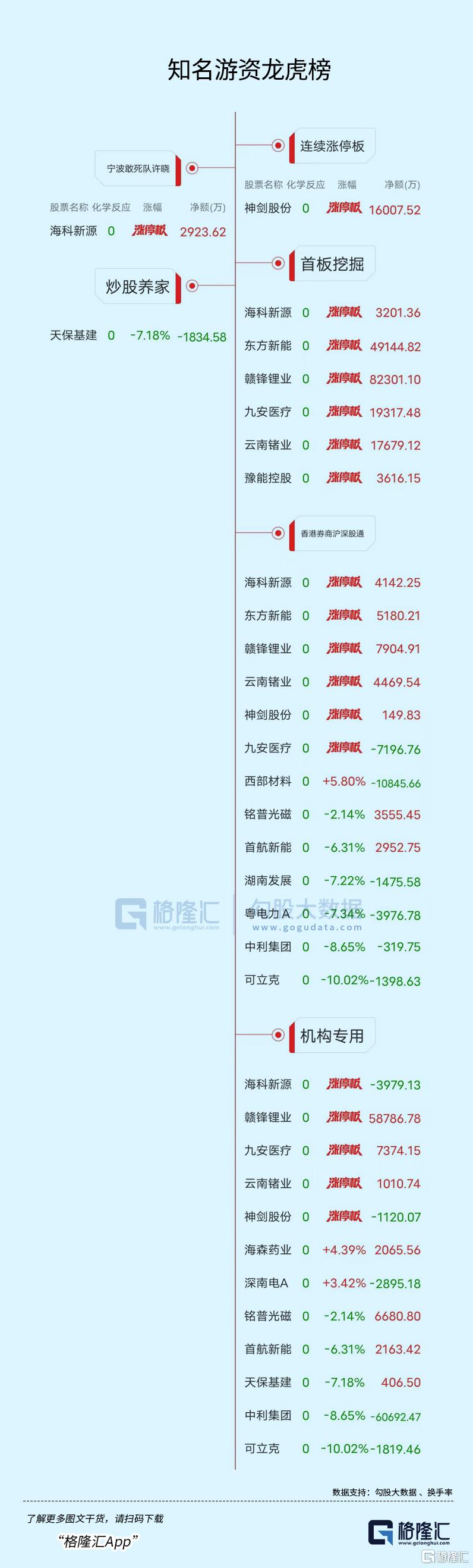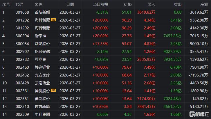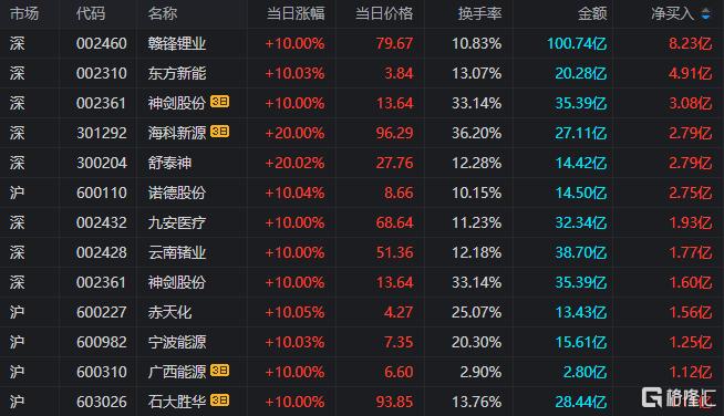 龙虎榜单日净买入额前三为赣锋锂业、东方新能、舒泰神,分别为8.23亿元、4.91亿元、2.79亿元。