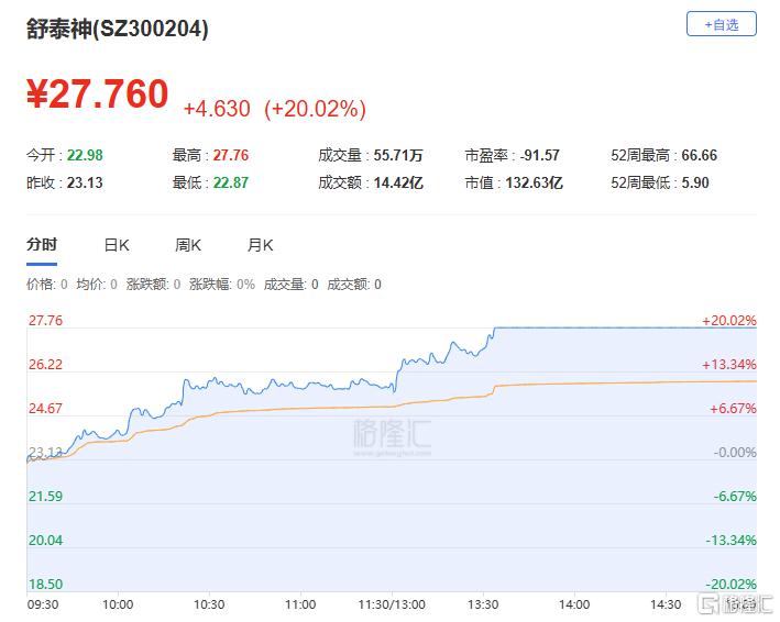 舒泰神:今日涨停,全天换手率12.28%,成交额14.42亿元,振幅21.38%。机构净买入698.54万元,深股通净买入7015.15万元,营业部席位合计净买入2.02亿元。