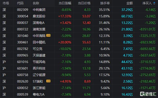 龙虎榜单日净卖出额前三为中利集团、鼎龙股份、深南电A,分别为6.14亿元、3.24亿元、1.20亿元。