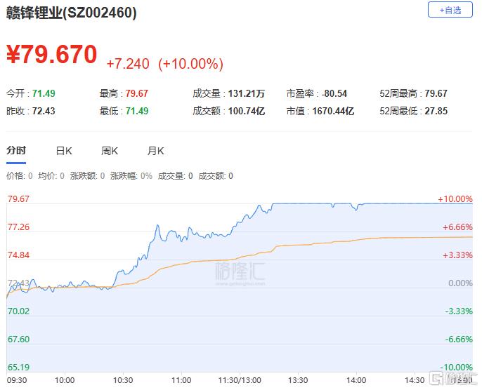 赣锋锂业:今日涨停,全天换手率10.86%,成交额100.74亿元,振幅11.44%。机构净买入3.03亿元,深股通净买入7904.91万元,营业部席位合计净买入4.40亿元。