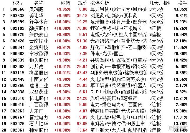 高位股方面,算力租赁概念股奥瑞德8天5板;美诺华6天5板,舒华体育6天4板,融捷股份、新能泰山均晋级4连板,云南锗业6天3板,金煤科技5天3板,宁波能源、狮头股份等4天3板。