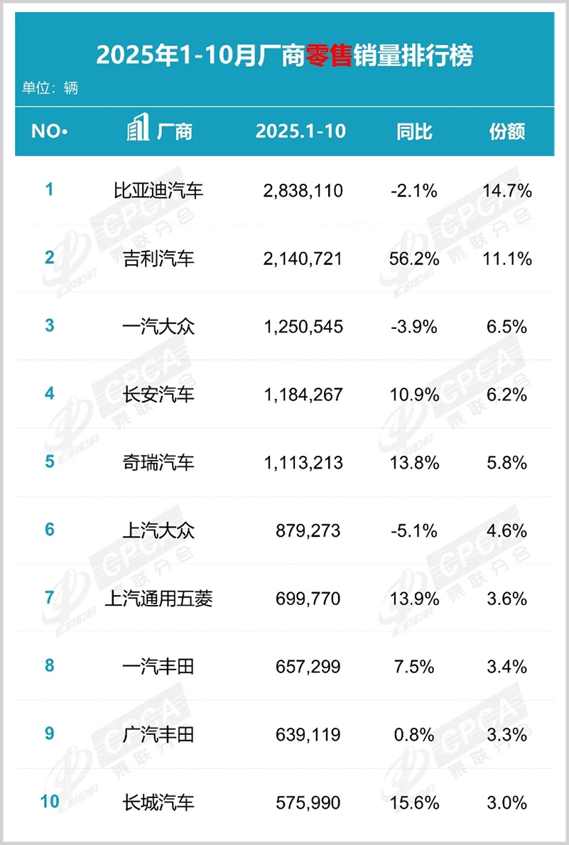 根据乘联分会数据,吉利汽车前10个月国内总销量超214万辆,以56.2%的增速领先TOP10同行40-60个百分点,高于大盘48个百分点,是同期国内销量增速最快的车企。
