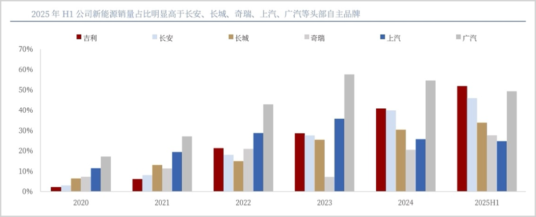 2022年以前,吉利的新能源销量占比在自主品牌中几乎是最低的,但随后数据逐渐拉升,特别是去年以来,整个新能源进程加速是肉眼可见的。