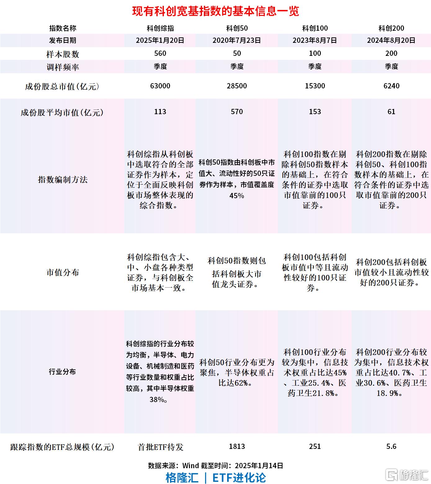 截至2025年1月14日,科创50ETF的合计规模为1813亿元,科创100ETF的跟踪规模为251亿元,科创200ETF的跟踪规模为5.6亿元,合计为2069.6亿元。科创板指数产品化有效引导资金支持“硬科技”发展,增强资本市场对提高我国关键核心技术创新能力的服务水平。