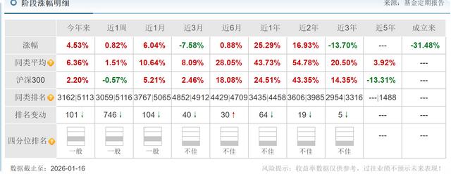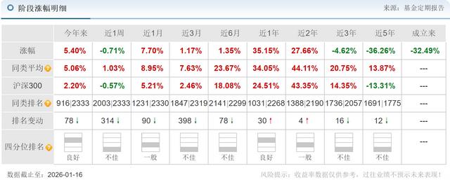 笔者还发现,该基金在2024年2季度买入3.00万股的腾讯控股,2024年3季度持有3.00万股,2024年4季度持有3.35万股。2025年1季度持有3.82万股,2025年2季度持有4.21万股,2025年3季度持有4.21万股。在该基金持有期间,在2024年4月1日-2026月1月16日股票价格上涨了104%。从2025年持股收益看出,2025年收益优异,但由于基金成立之初,由于市场回调影响,基金业绩仍处于亏损状态。