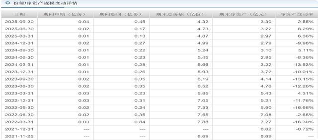 基金业绩下降,基金规模也出现下降。长城健康消费混合A基金成立之初募集了8.69亿元,但成立后不久,基金规模不增反降。各季度基金赎回均高于申购。截至2025年9月30日,长城健康消费混合A,期末净资产3.30亿元,比上期增加2.55%。