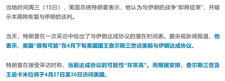 消息面上,美方表示,与伊朗的战争“即将结束”,并暗示本周有望恢复双方谈判。此外,美国领导层还给出了达成协议的潜在时间表,称“很有可能”在英国国王查尔斯三世4月下旬访美(4月27日至30日)之前,与伊朗方面达成协议。