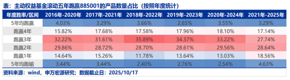 时间拉长到3年,运气因素被部分过滤掉后,更可能体现了基金经理或其团队在选股、择时或风险管理上具备一定的可持续能力,30%—35%可以看作是市场上真正具备超额收益的基金的大致占比;