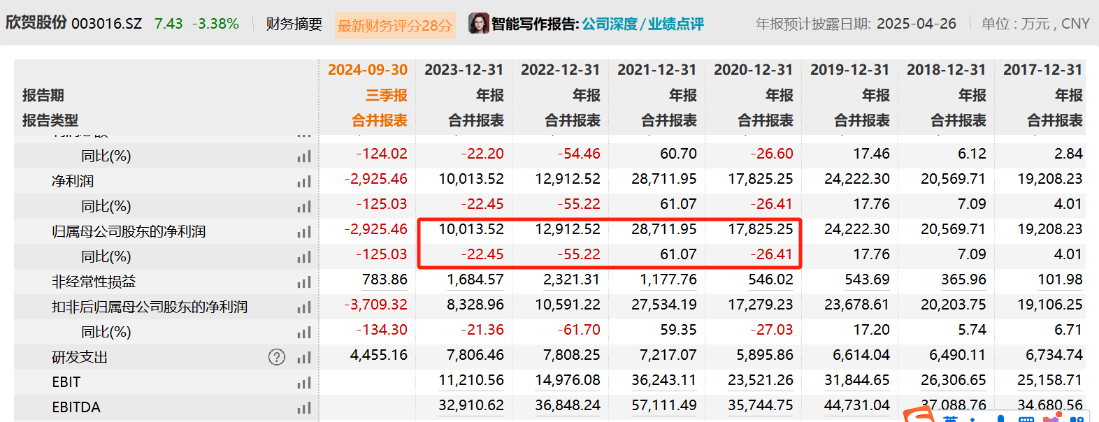 2025年1月24日,欣贺股份披露2024年业绩预告,预计实现归母净亏损4800万元–7200万元,较上年同期下降147.94%–171.90%;预计实现扣除非经常性损益后的净亏损5600万元–8300万元,较上年同期下降167.24%–199.65%。