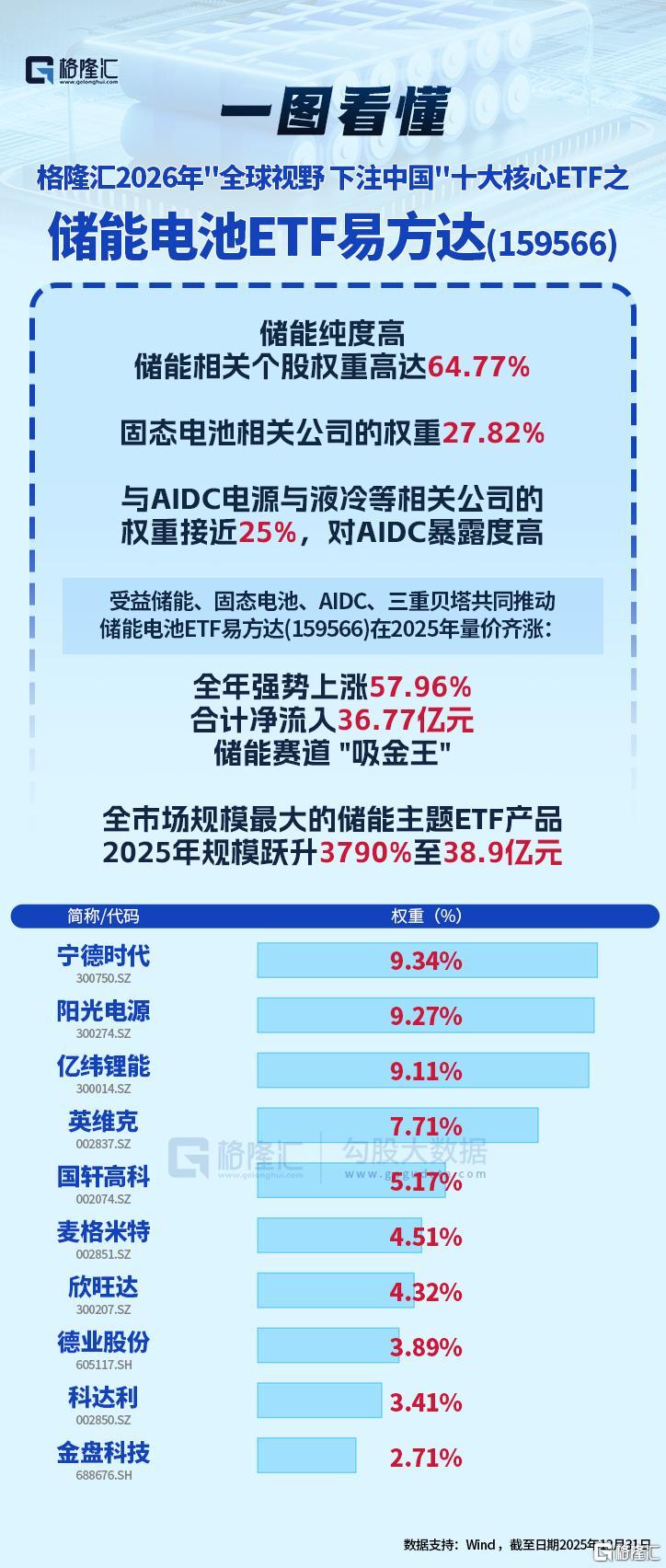 正是在这一背景下,格隆汇将储能电池ETF易方达(159566)纳入2026年“全球视野,下注中国”十大核心ETF。